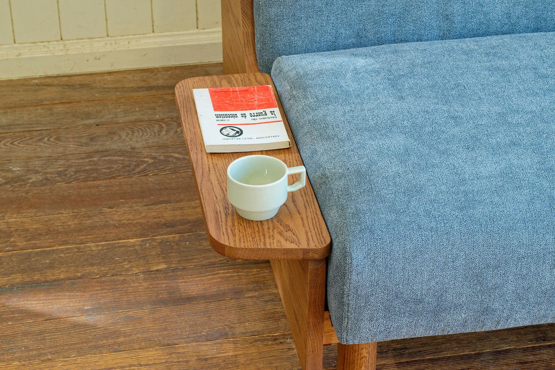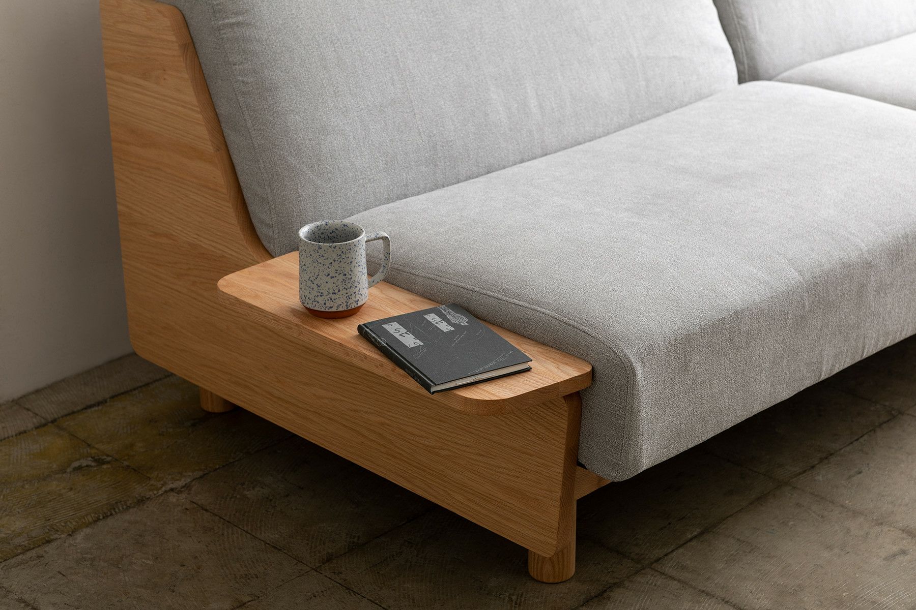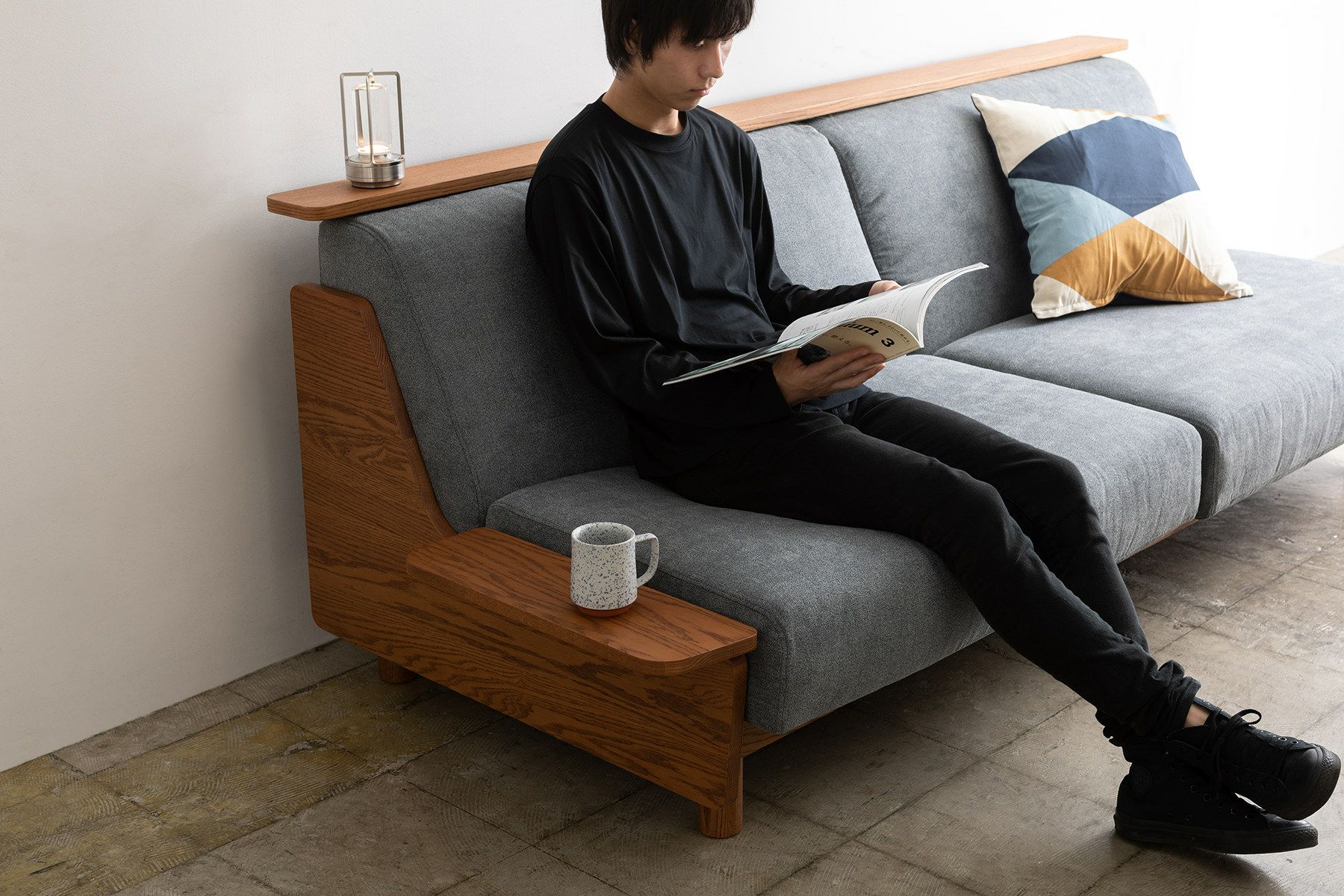 これまではソファの前にローテーブルを置くレイアウトが一般的で、部屋を狭く感じさせる原因の一つとなっていました。 本体側面にオプションのテーブルを組み合わせることで、ソファーの前にローテーブルを置かない、空間を広くゆったりと使うレイアウトを実現します。
