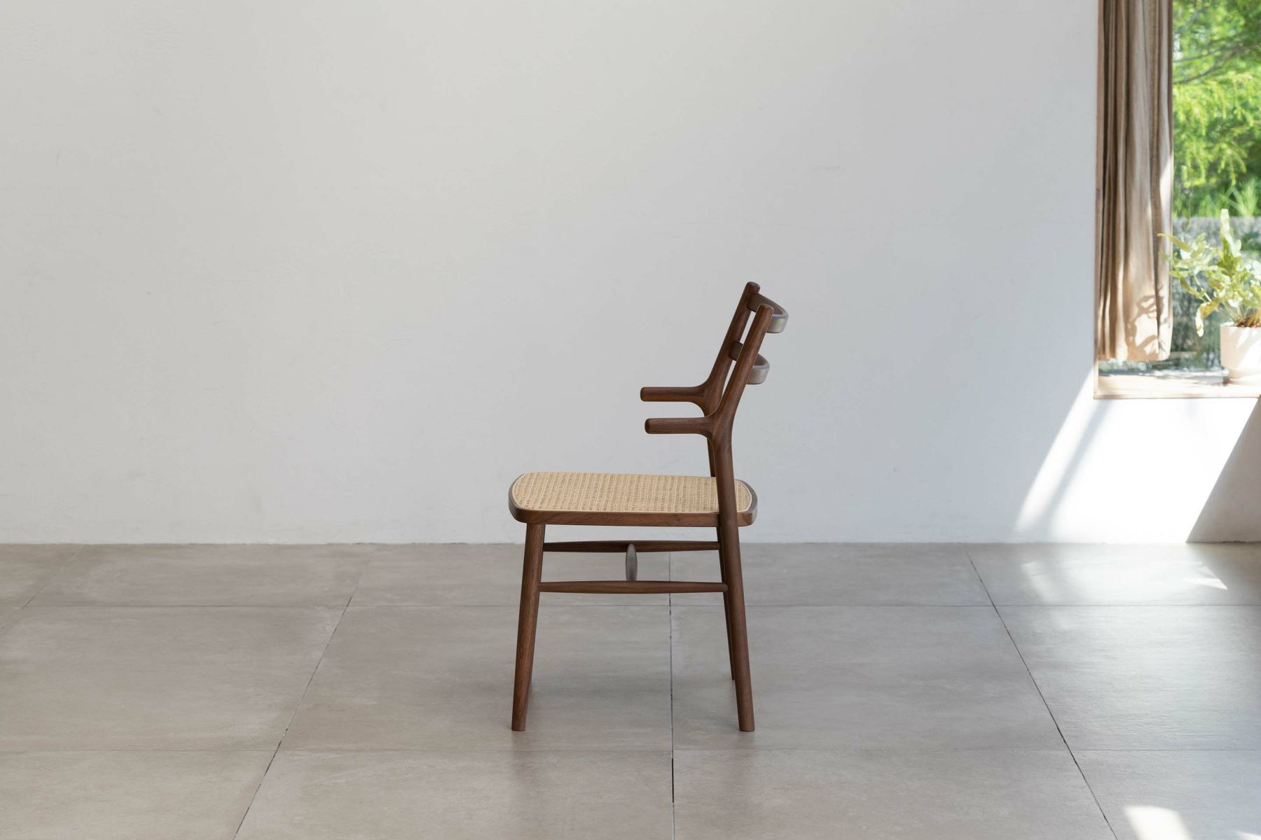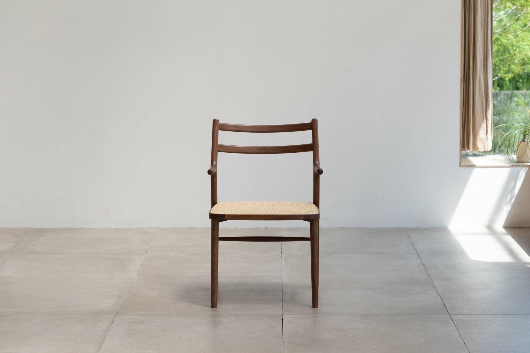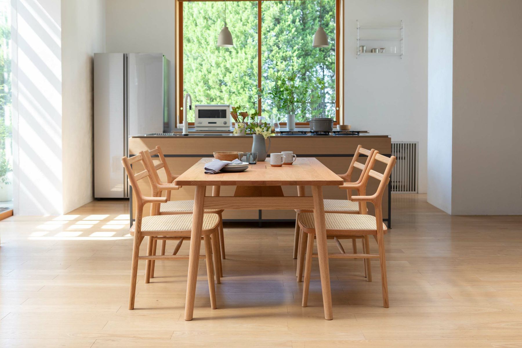 食事だけではなく、さまざまな用途で使用されるダイニングスペース。その分だけ座る時間も長くなります。座面にはカゴメ編みの籐(とう)と適度な硬さを実現するメッシュシートの2つの素材を使うことで、仕事や長時間の作業でも疲れにくい快適な座り心地を実現しています。また、座った際の肘置きや立ち上がる際の手掛けとして便利なアームはサイズを小ぶりにすることで、作業する際などに邪魔になりがちな一般的なアームチェアの不便さを解消しました。
