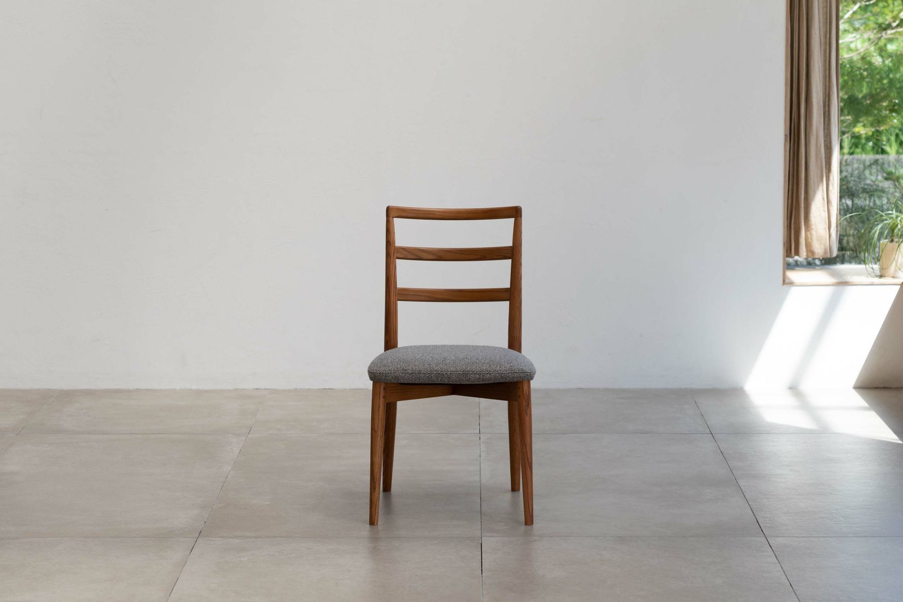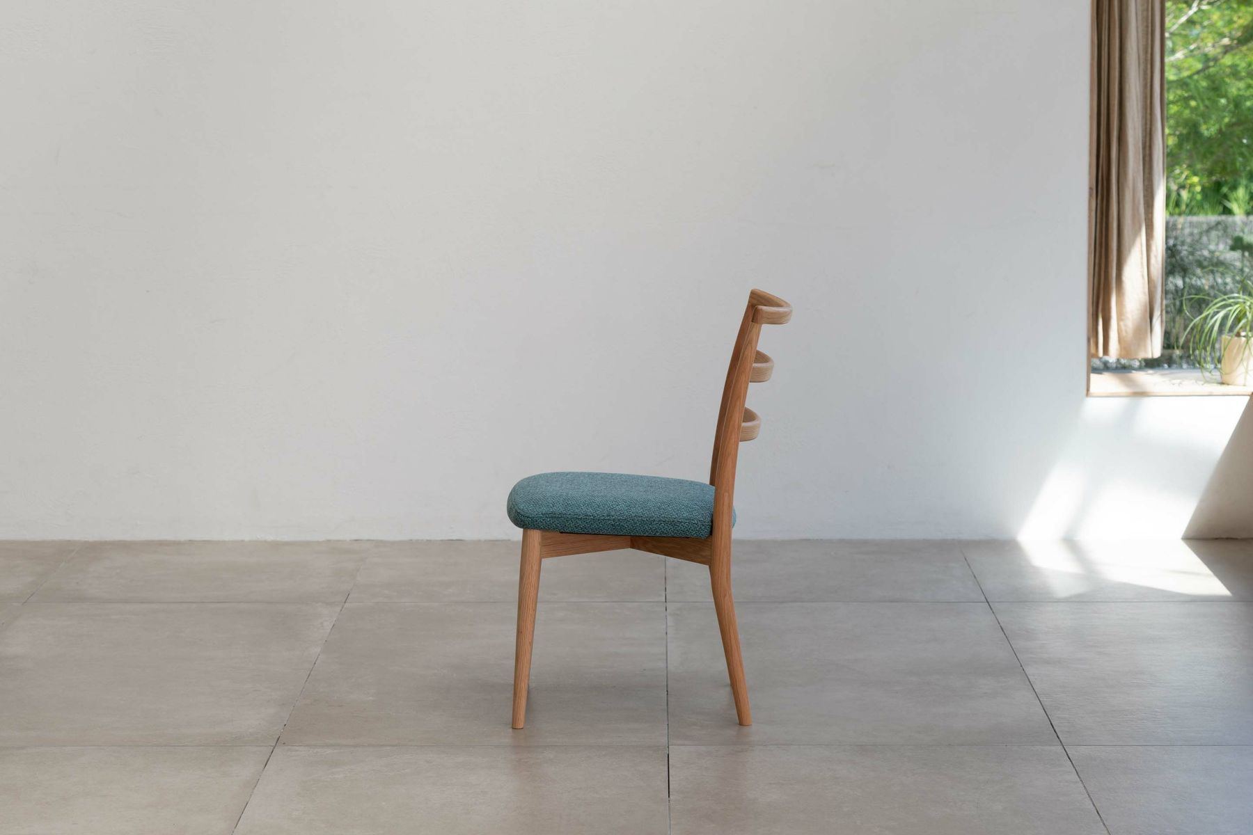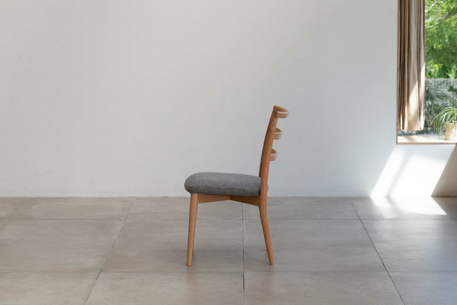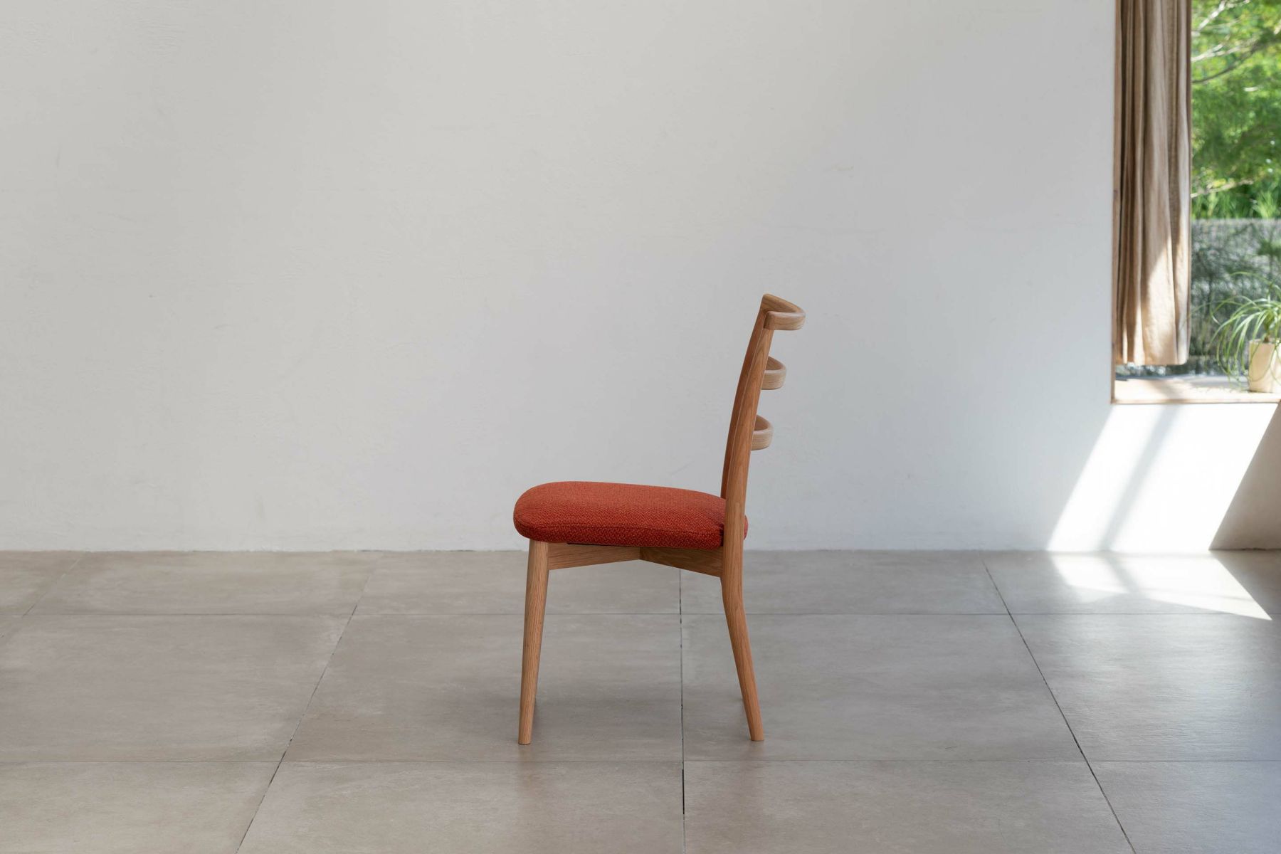 ダイニングルームの雰囲気を大きく左右する椅子は、使い勝手とサイズのバランスも重要になります。『レフィールチェア』は幅が46㎝とコンパクトで空間を圧迫せず、取り回しも容易です。3つの曲線を描いた背もたれが背中から腰までをきちんと支え、コンパクトながらしっかりとした座り心地を実現しています。