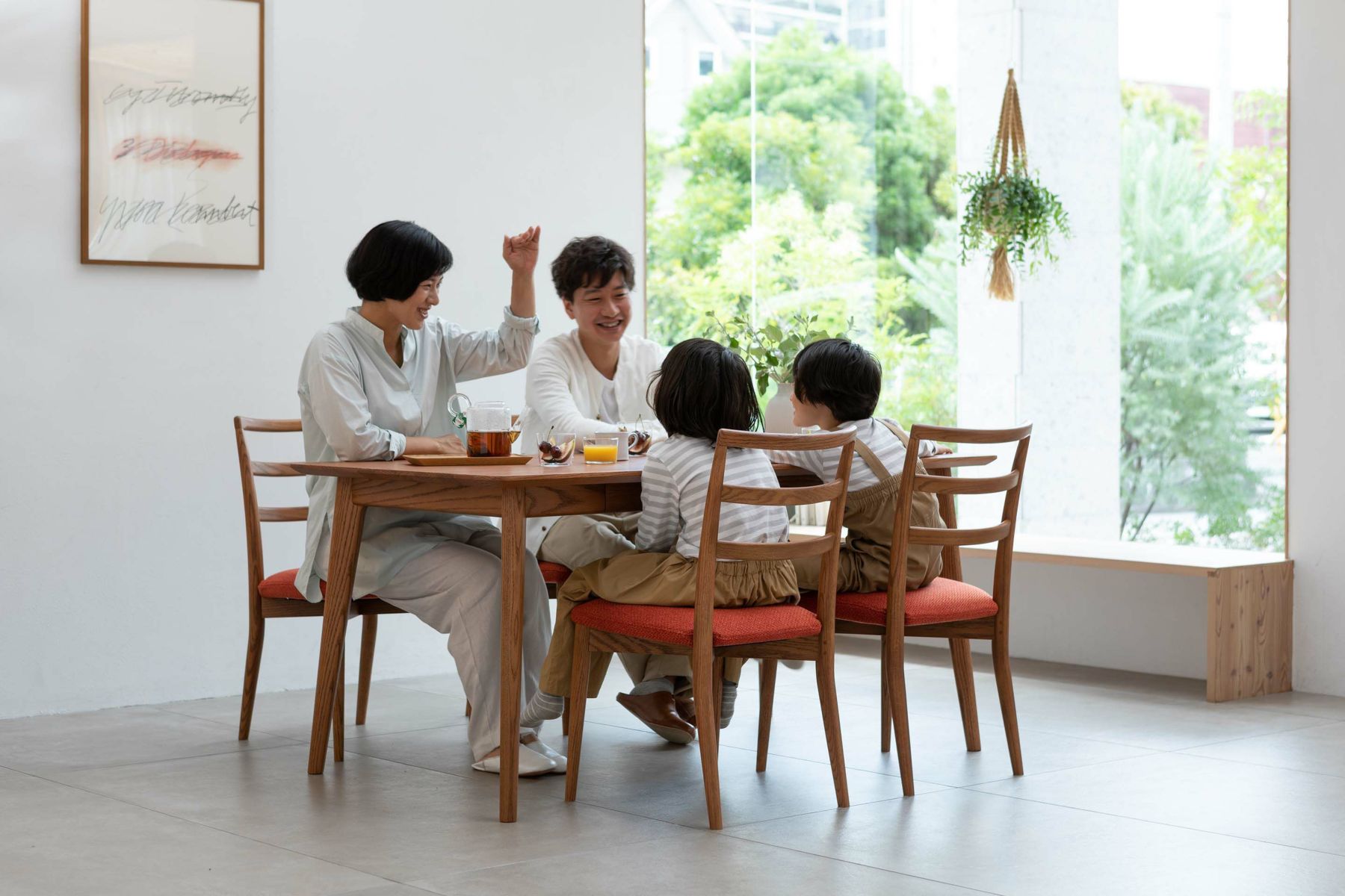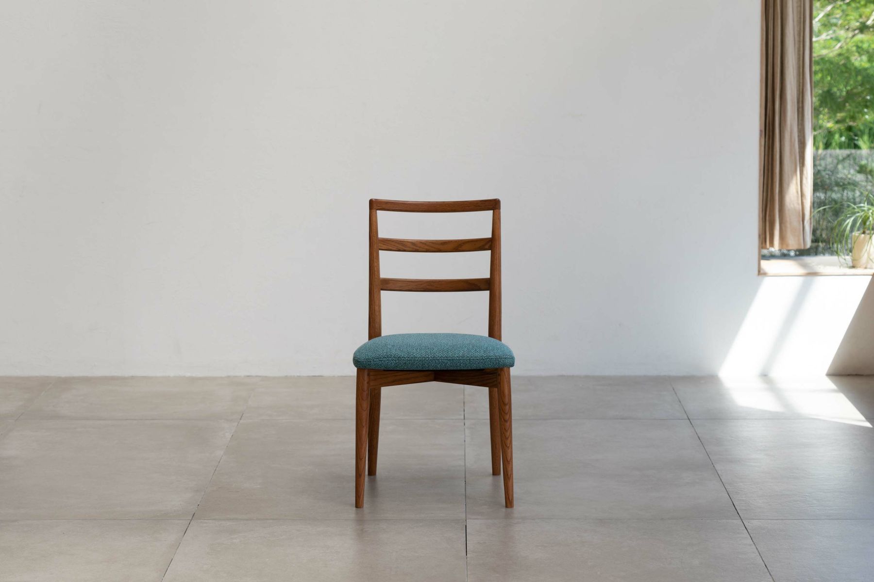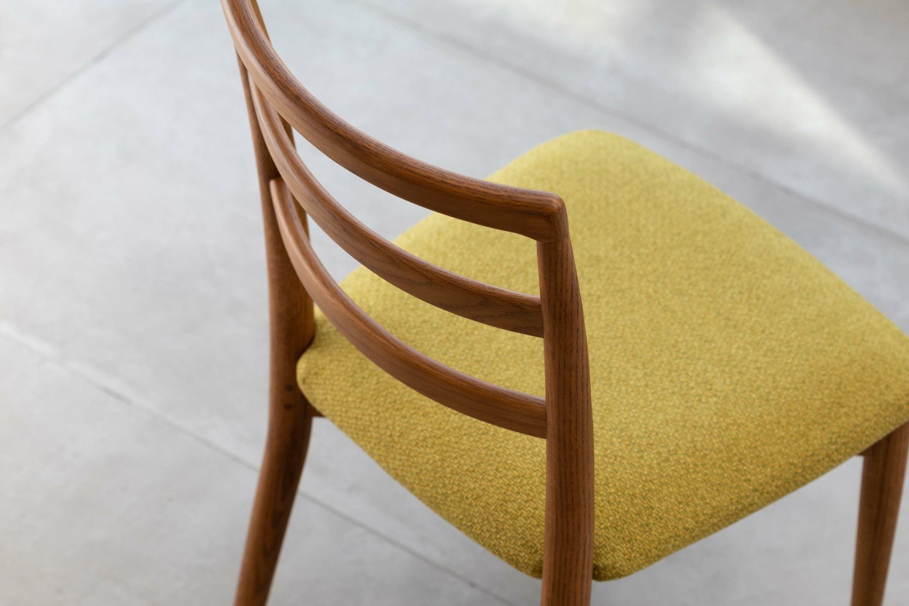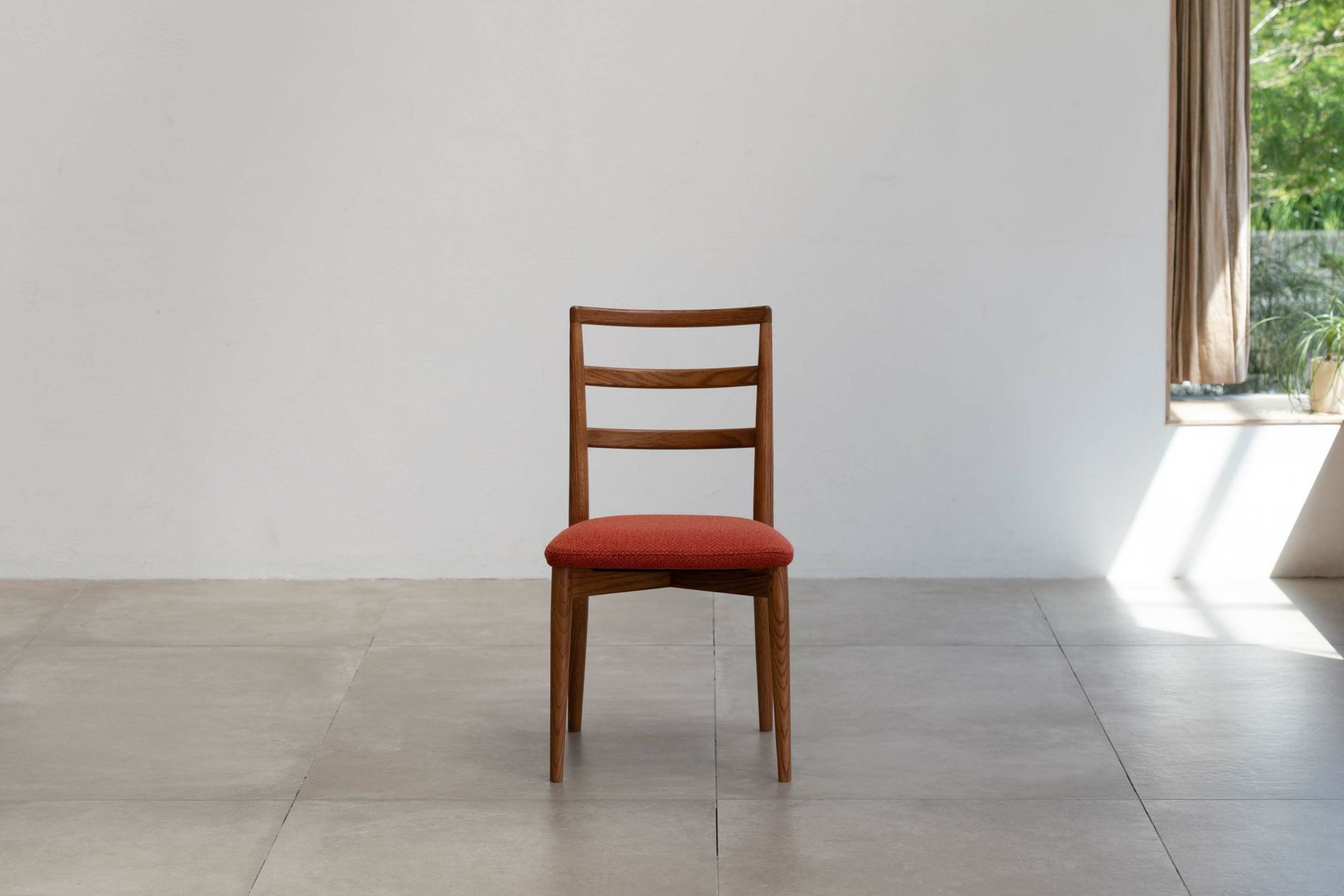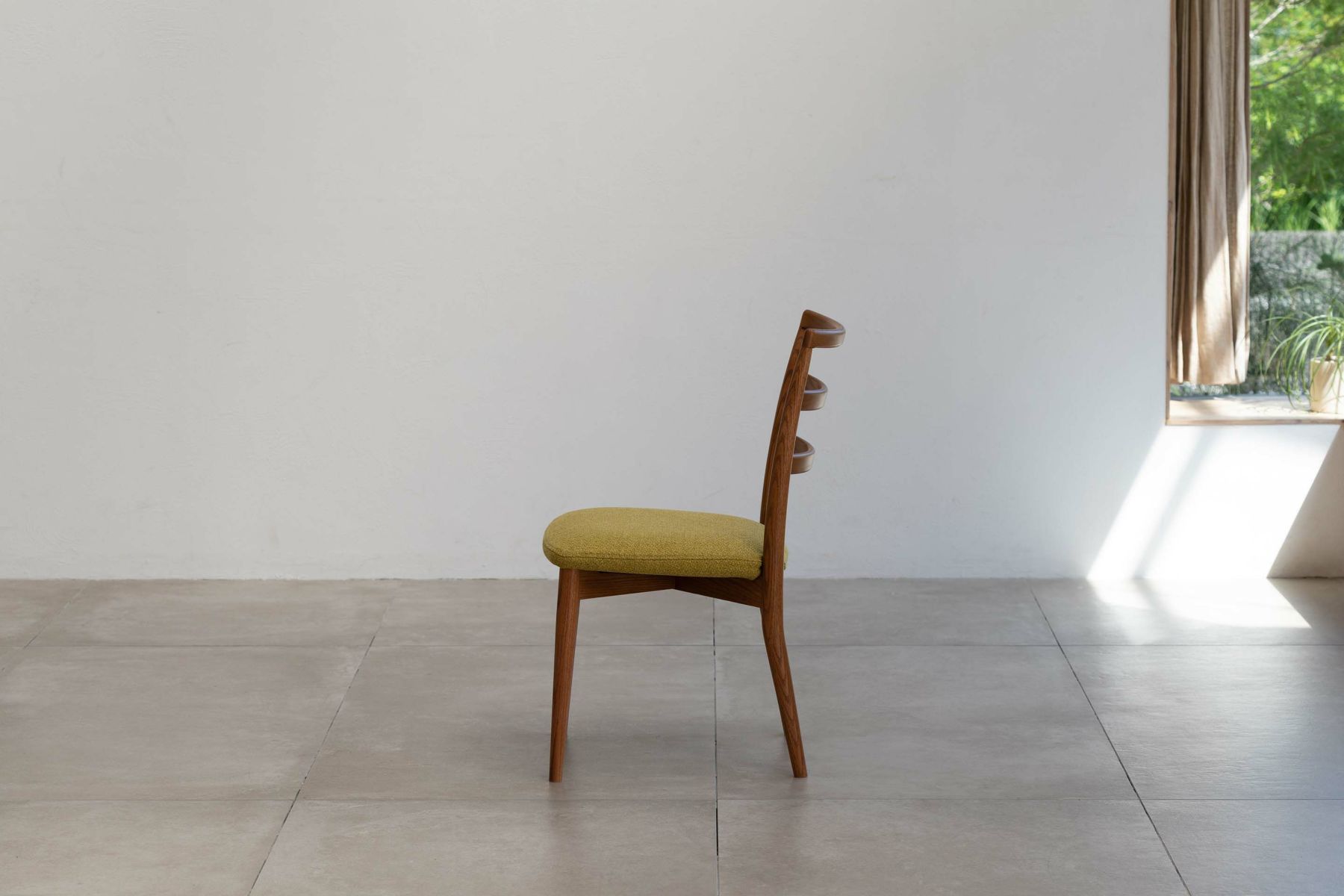 ダイニングルームの雰囲気を大きく左右する椅子は、使い勝手とサイズのバランスも重要になります。『レフィールチェア』は幅が46㎝とコンパクトで空間を圧迫せず、取り回しも容易です。3つの曲線を描いた背もたれが背中から腰までをきちんと支え、コンパクトながらしっかりとした座り心地を実現しています。